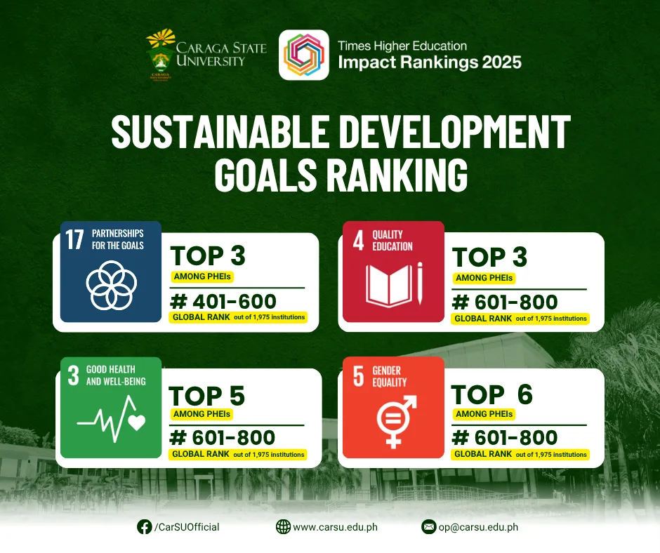 Caraga State University (CSU) makes an impressive debut in the 2025 Times Higher Education Impact Rankings, ranking as the 5th best university in the country and leading the 3rd spot in the 601-800th global bracket. Remarkably, CSU is the only newcomer to break into the national Top 10 on its first application for assessment.