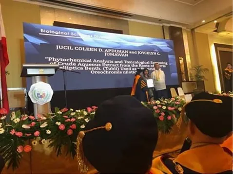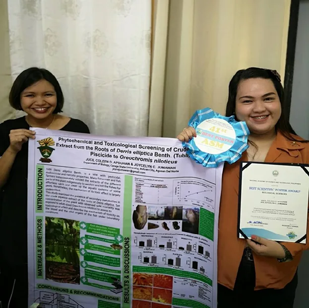 The poster entitled “Phytochemical Analysis and Toxicological Screening of Crude Extracts from the roots of Derris elliptica Benth. (Tubli) Used as a Piscicide to Oreochromis niloticus” bested other entries for the biological sciences category. Dr. Jumawan and Miss Apduhan received a certificate of recognition and a cash prize. CMG/pico