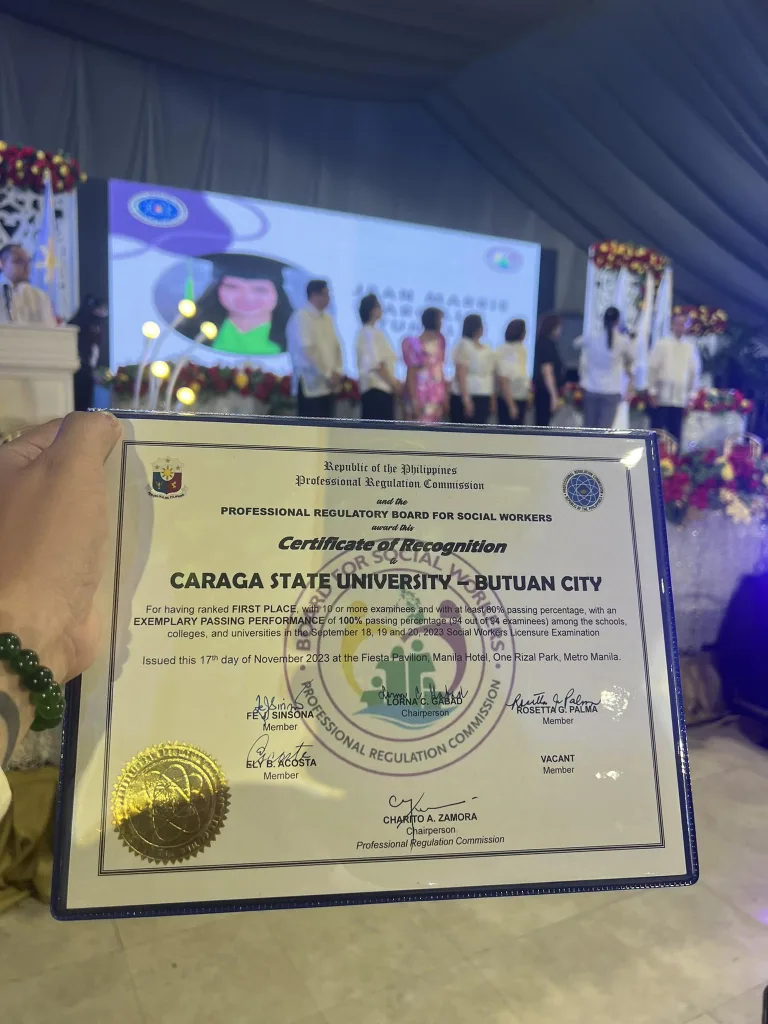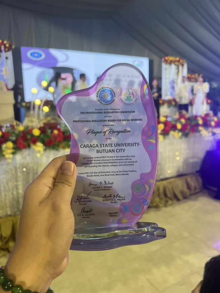 The BS Social Work program at Caraga State University has once again been recognized as the top-performing school in the Philippines, achieving a 100% success rate for its graduates during the recent Oath-Taking and Induction Ceremonies of New Social Workers on November 17, 2023, at Manila Hotel.
