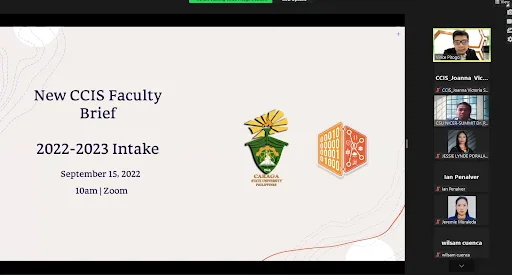 The CCIS welcomes its eleven (11) new teaching personnel by conducting the “New CCIS Faculty Brief 2022 – 2023 Intake”, held on September 15, 2022, via the Zoom platform. The CCIS Dean with the CCIS Associate Dean – Dr. Vicente A. Pitogo, and the Program Chairpersons from Bachelor of Science in Computer Science (BSCS), Bachelor of Science in Information Systems (BSIS), and Bachelor of Science in Information Technology (BSIT).