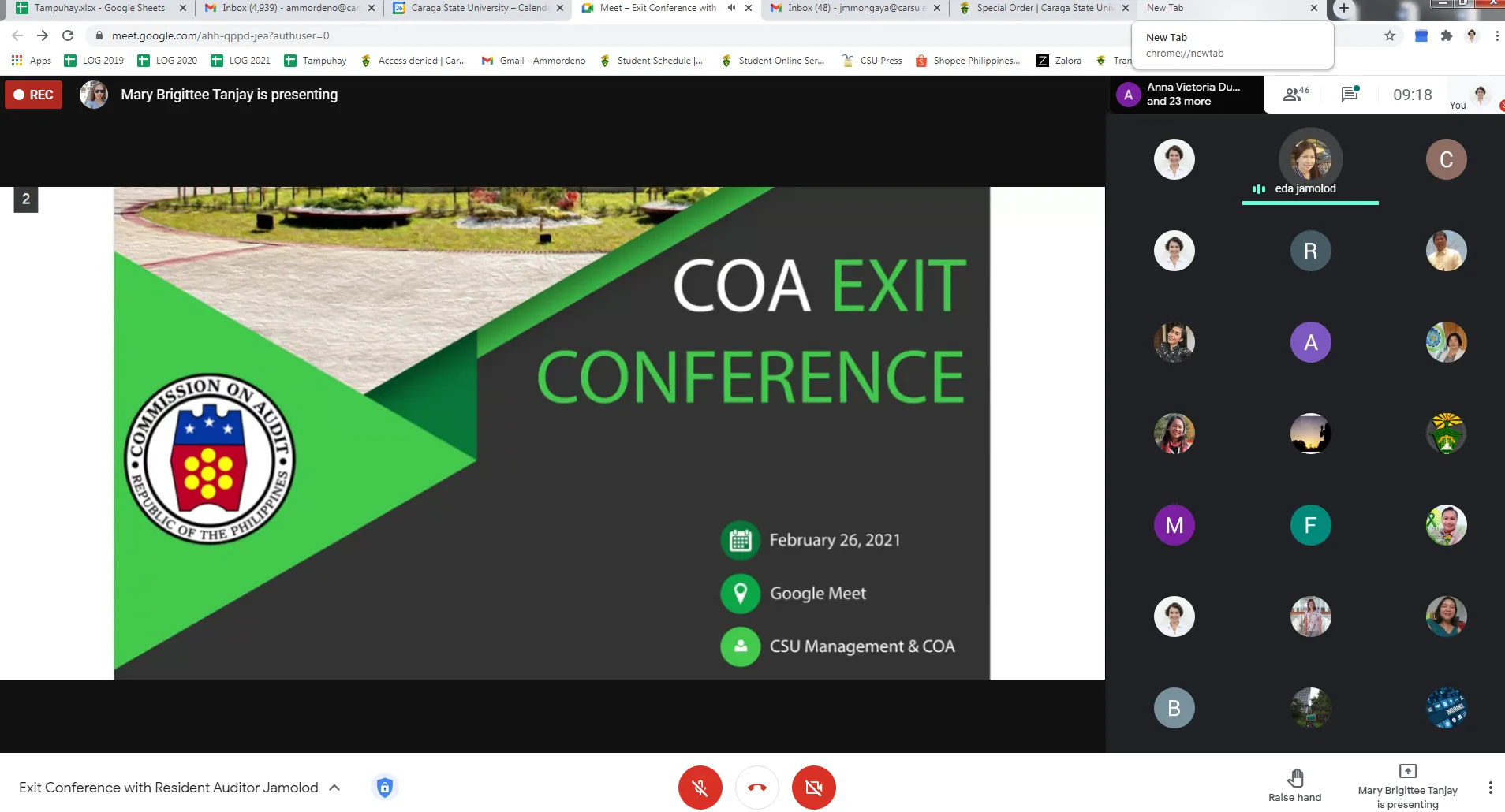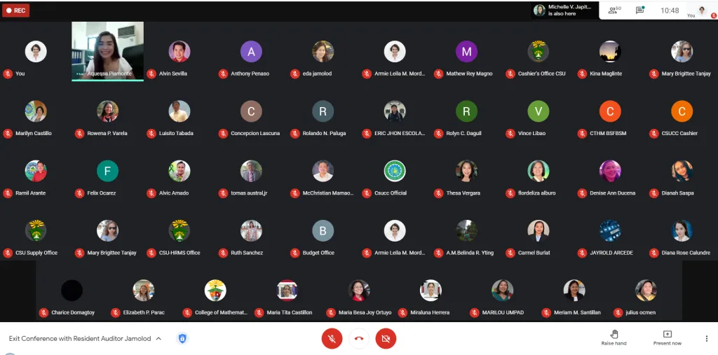 CSU President, Dr. Anthony M. Penaso with other university executives and the Commission on Audit Assistant Regional Director Matthew Rey M. Magno and his team, Resident Auditor for CSU, Ms. Eda Christine T. Jamolod, who is also the Audit Team Leader with Mary Bridgette A. Tanjay and Saidali A. Delama as members, met on virtual Exit Conference on February 26, 2021.