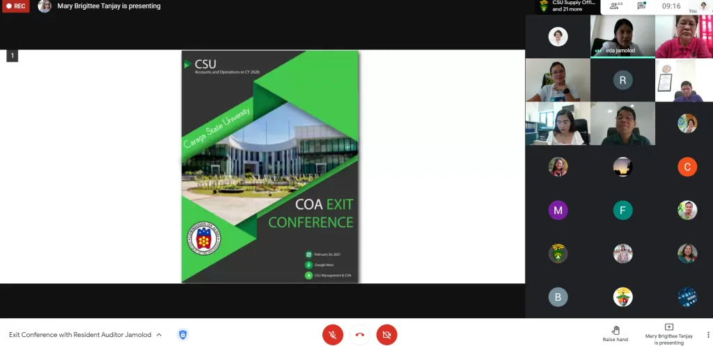 The core of the discussion was on the annual audit report of COA for Fiscal Year 2020 containing observations and recommendations on the CSU’s financial operations. The exit conference is the meeting at the end of an audit engagement where the auditors and client meet to discuss the findings of the audit and the recommendations in the report.