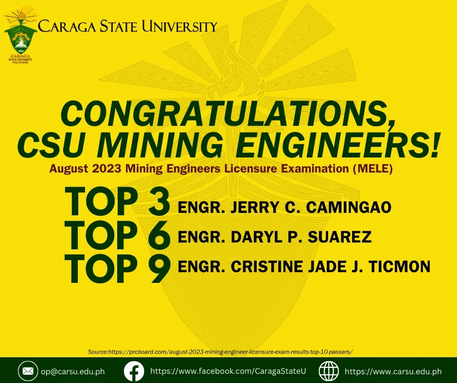 CSU repeats the feat! This time, three (3) BS Mining Engineering graduates โ now mining engineers โ secured top spots in the list of successful examinees who garnered the first 10 highest places in the recent Mining Engineers Licensure Examination (MELE) held last August 22-24, 2023. ๐๐ฒ๐ฟ๐ฟ๐ ๐. ๐๐ฎ๐บ๐ถ๐ป๐ด๐ฎ๐ผ is this yearโs top 3 (86.55%), followed by ๐๐ฎ๐ฟ๐๐น ๐ฃ. ๐ฆ๐๐ฎ๐ฟ๐ฒ๐ in the 6th (85.60%) and ๐๐ต๐ฟ๐ถ๐๐๐ถ๐ป๐ฒ ๐๐ฎ๐ฑ๐ฒ ๐. ๐ง๐ถ๐ฐ๐บ๐ผ๐ป in the 9th (85.25%) spots, respectively. A total of 59 new CSU Mining Engineers have passed the licensure examination.