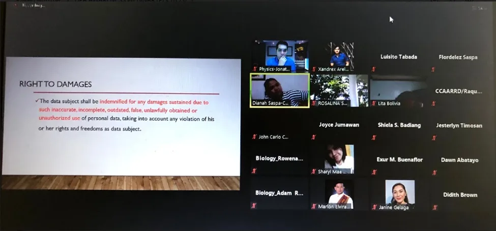 Caraga State University conducted a webinar on Data Privacy Act of 2012 on January 20-21, 2021 via Zoom at 1:30 in the afternoon. The goals of the said webinar are to enhance knowledge on Data Privacy Act of 2012, develop awareness in data handling, and develop skills in data security.