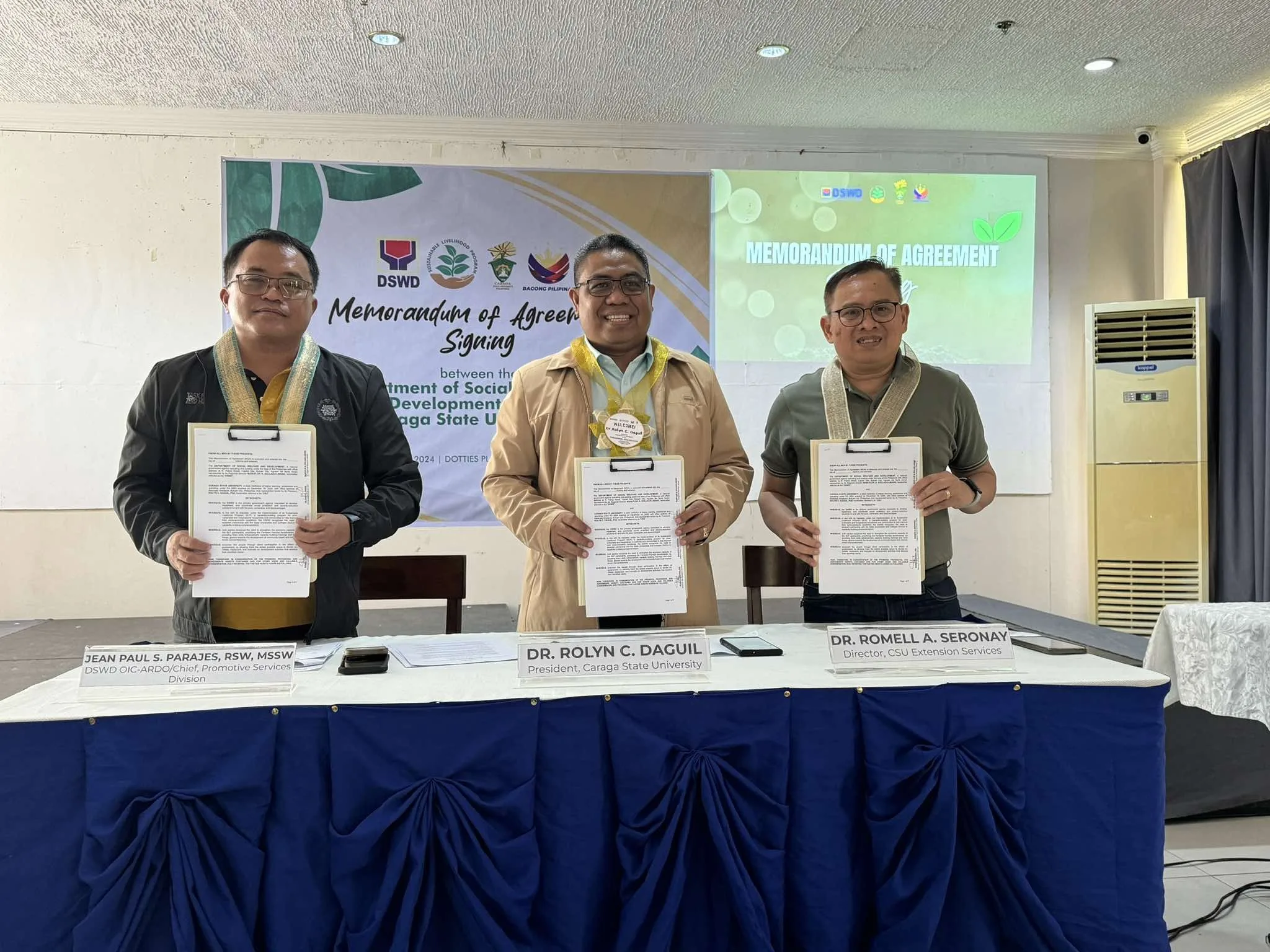 The Caraga State University (CSU) and the Department of Social Welfare and Development – Field Office Caraga (DSWD – FO Caraga) joined forces to bolster the Sustainable Livelihood Program (SLP), formalized through the signing of a Memorandum of Agreement (MOA) on August 9, 2024, at Dotties Place Hotel, Butuan City.