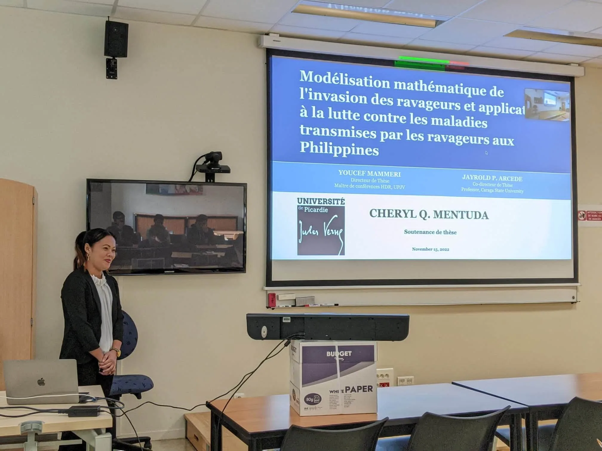 Dr. Cheryl Quindao Mentuda, a faculty from the Mathematics, College of Mathematics and Natural Sciences (CMNS) has earned her degree Doctor in Mathematics, from the Université de Picardie Jules Verne (UPJV), Amiens France. Her dissertation is entitled Mathematical Modelling of Pest Invasion and Application to the Fight Against Pest-Borne Disease in the Philippines. Her International Advisor/Director was Dr. Youcef Mammeri of UPJV. Co-thesis Director Dr. Jayrold Arcede of Caraga State University.