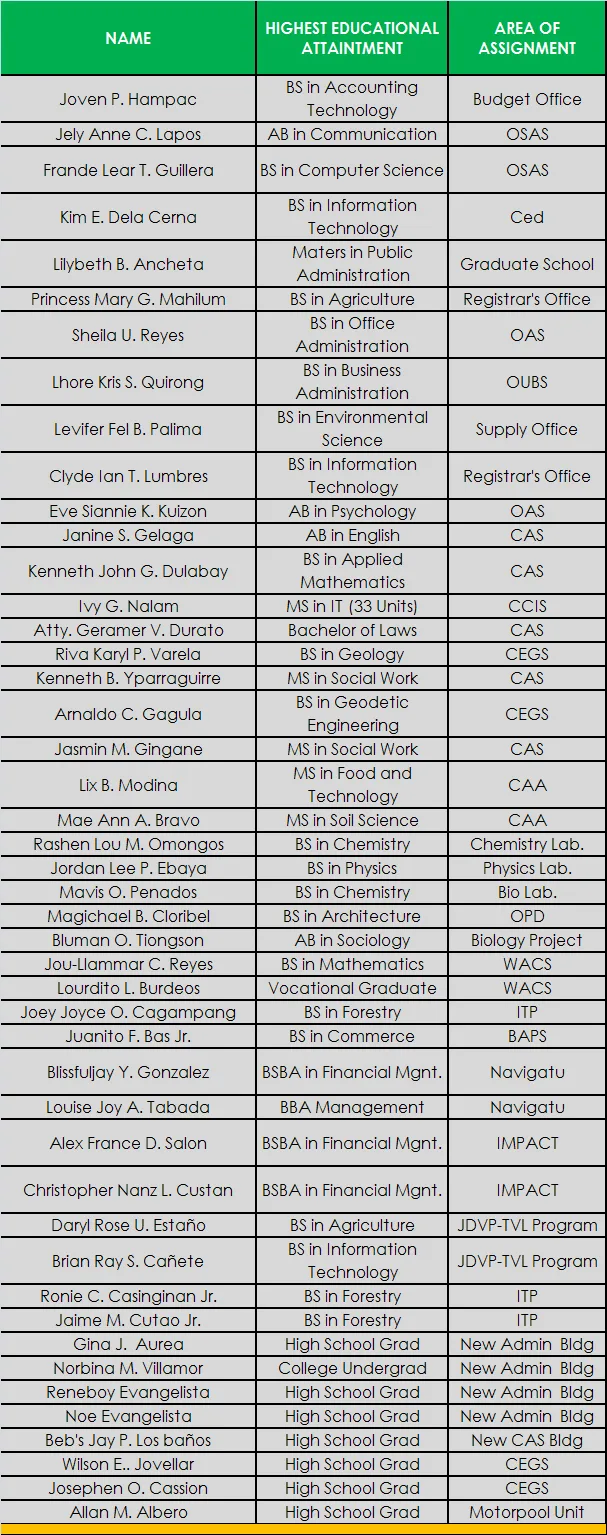 The newly hired were assigned to the different offices in the university, namely: Budget Office, Office of Student Affairs and Services, Office of the University Registrar, Office of Admission and Scholarship, Office of the University Board Secretary, Supply Office, Office of Public Development, General Services Office, College of Education, College of Arts and Sciences, College of Computing and Information Systems, College of Engineering and Geo Sciences, College of Agriculture and Agri-Industries, Graduate School, WACS, ITP, BAPS, Navigatu, IMPACT, and  JDVP-TVL Program. ARP/OVPAF/pico