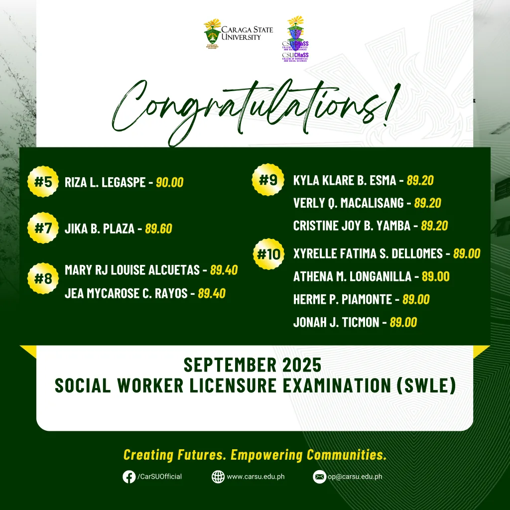 CSU is Top 2 in PH; produces 133 newly registered Social Workers, 11 top examinees