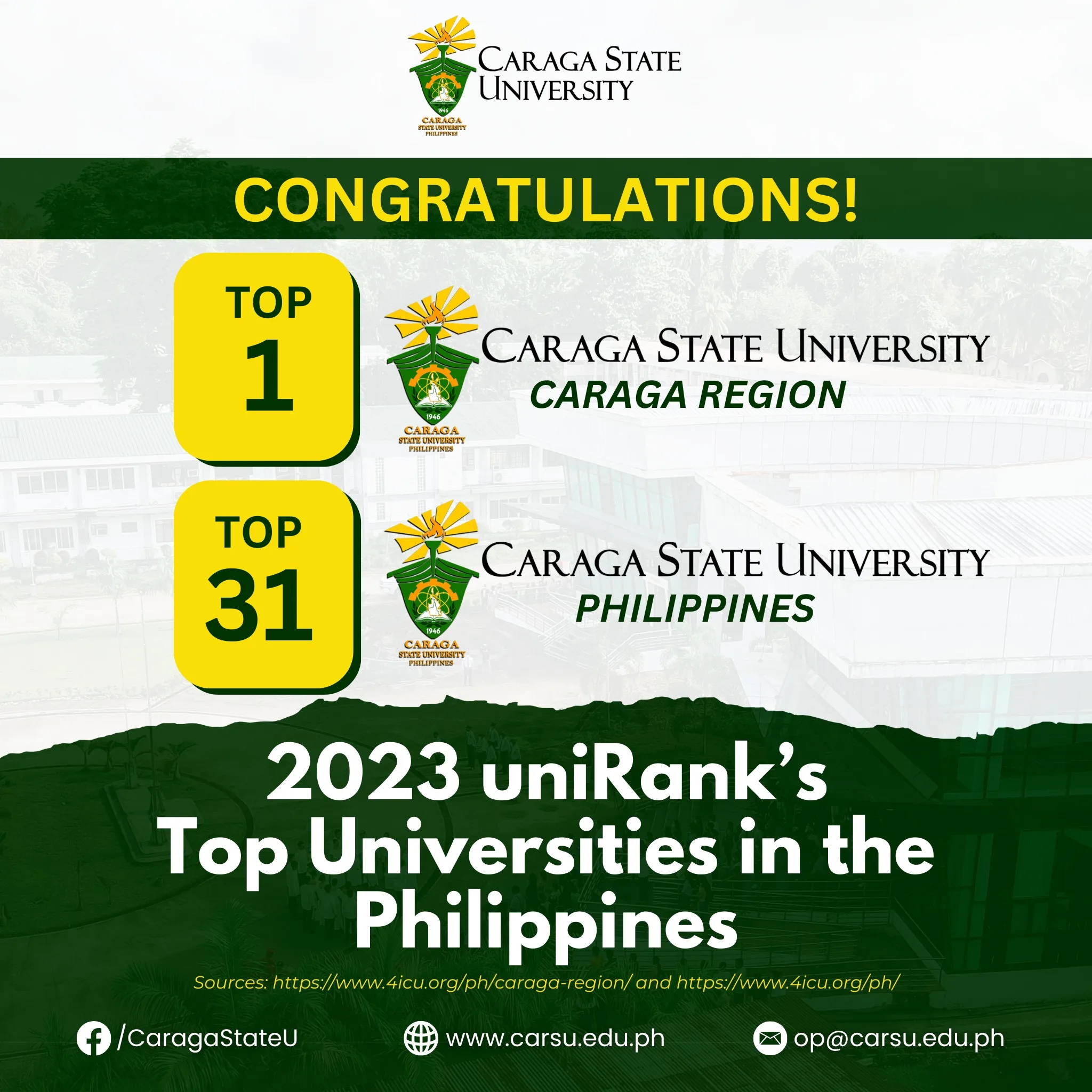 The Caraga State University ranked 31st in the entire Philippines and 1st in Caraga in the recent edition of uniRank’s Top Universities in the Philippines. This leading global ranking system recognized CSU and 232 Philippine Higher Education Institutions (HEIs).