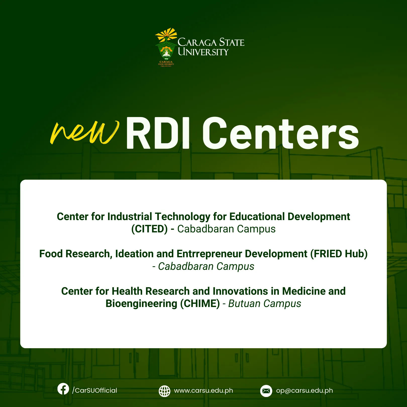 Caraga State University (CSU) proudly introduces its three (3) new Research and Development and Innovation (RDI) Centers, following the approval from its Board of Regents on August 7, 2025.