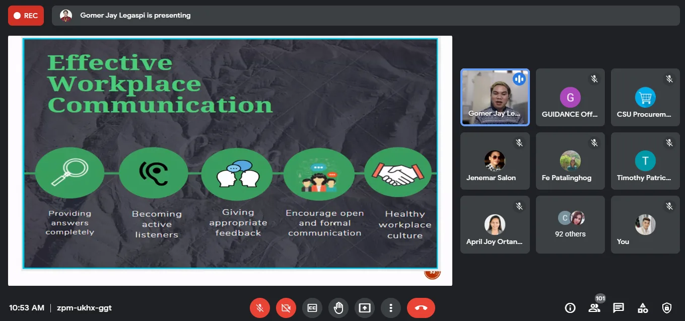 The webinar was attended by the CSU personnel in different colleges and units, numbering to 150 participants. CSU President, Dr. Anthony M. Penaso gave a resounding message.Mr. Gomer Jay S. Legaspi, a faculty member and Department Head of the of the College of Humanities and Social Sciences (CHASS), pivoted relevant and extensive discussions aimed at upskilling the personnel with the current trends and issues on business correspondence. Among the topics discussed were, professional writing and rhetoric, practice of written, oral, visual, and electronic communication, writing style, and critiquing of various business correspondence.