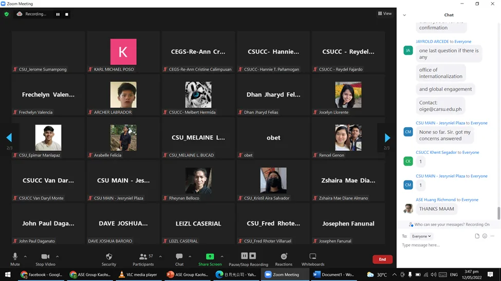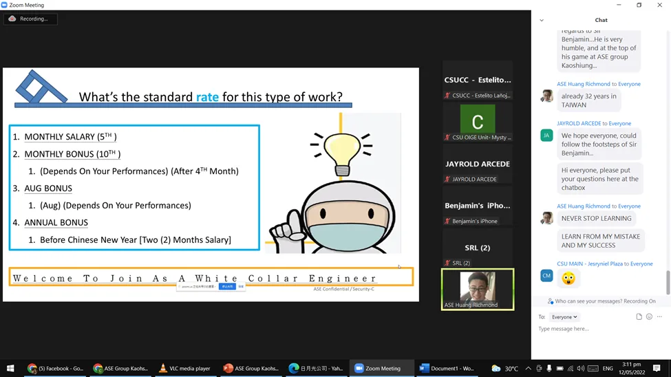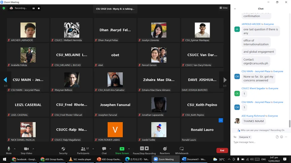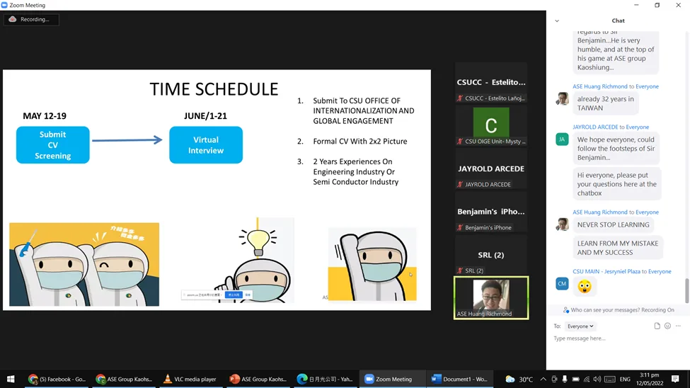 The Office of International and Global Engagement (OIGE) of Caraga State University has facilitated a virtual job placement orientation for our alumni through the ASE, in Kaohsiung, Taiwan. Dr. Jayrold Arcede, OIGE head with his staff arranged the virtual event. It was attended by a number of CSU alumni of Butuan City campus and Cabadbaran City campus, and some CSU officials on May 12, 2022.