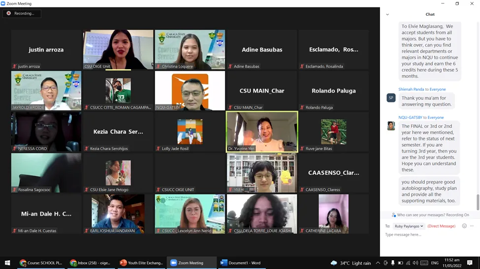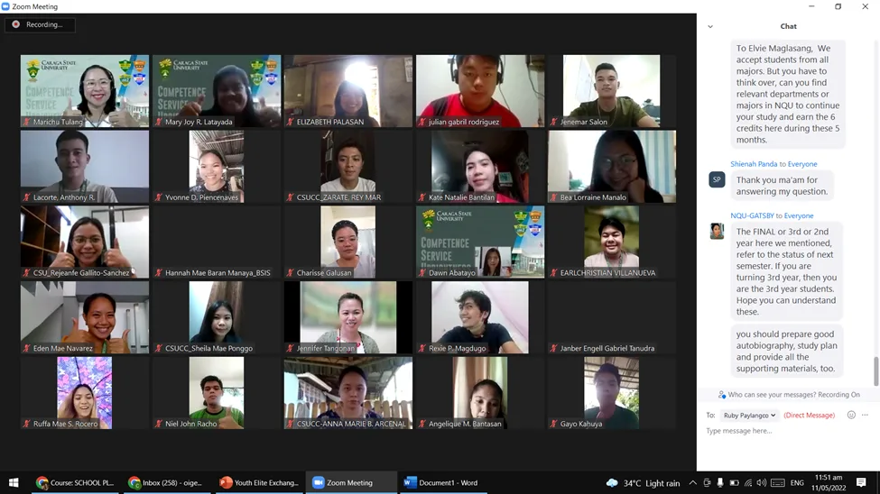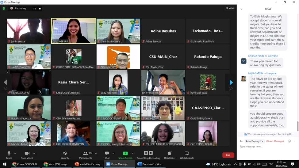 Caraga State University (CSU) the Office of Internationalization and Global Engagement (OIGE), spearheadedd an orientation on Elite Exchange Program with National Quemoy University (NQU), Taiwan on May 11, 2022, virtually via Zoom. The aim was to attract and inform students from Caraga State University to apply and join the Elite Exchange Program of National Quemoy University.