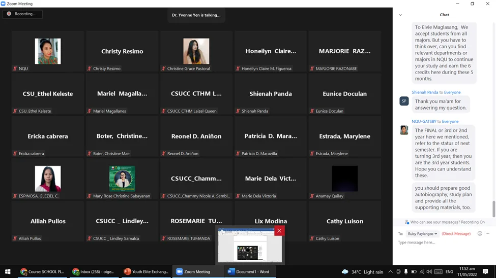 The orientation was held May 11, 2022, with a total 100 student participants. It was also attended by the Vice President for Academic Affairs, Dr. Rolando N. Paluga, the Director of Internationalization and Global Enaggement, Dr. Jayrold Arcede, the Dean of the international office of NQU, Dr. Yvonne Yu-Fang Yen, the Director of International Exchanges and Cooperation, Cheng, Ta-Hsing, and the Director of Chinese Language Center, Xu Yumin.