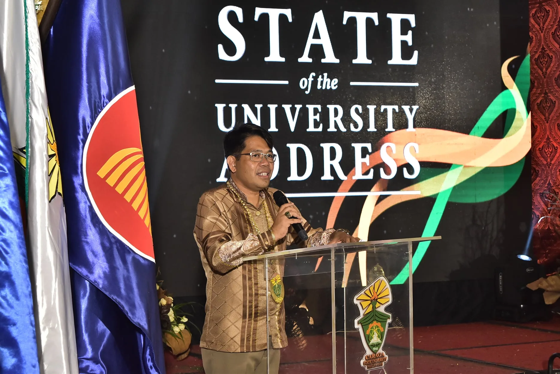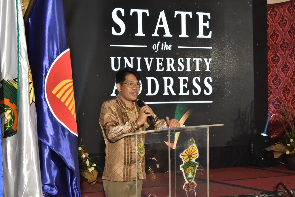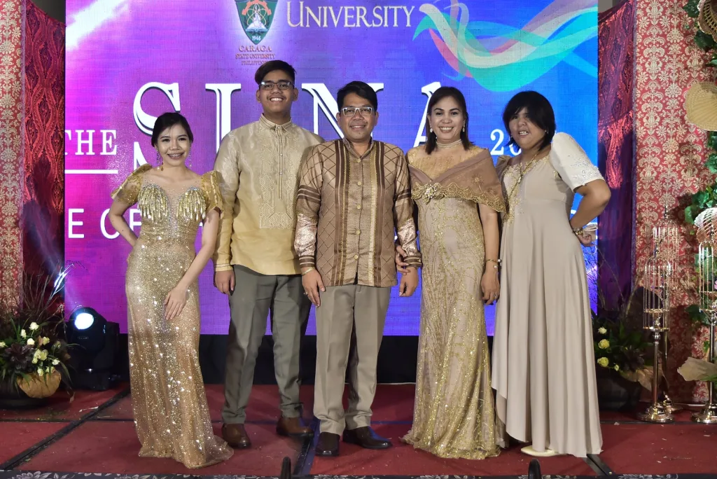 Splendid in his champagne barong, CSU President Anthony M. Penaso delivered his 2020 State of the University Address (SUna) at a calculated distance from a controlled small crowd of key officials, select stakeholders and development partners at the Pavillion, Watergate Hotel on May 18, 2021. Everyone were donned in Filipiniana attire with matching face masks, face shields, and physically distanced. Also present were the CSU first lady madam Abigail Noemis T. Penaso and the Penaso children.