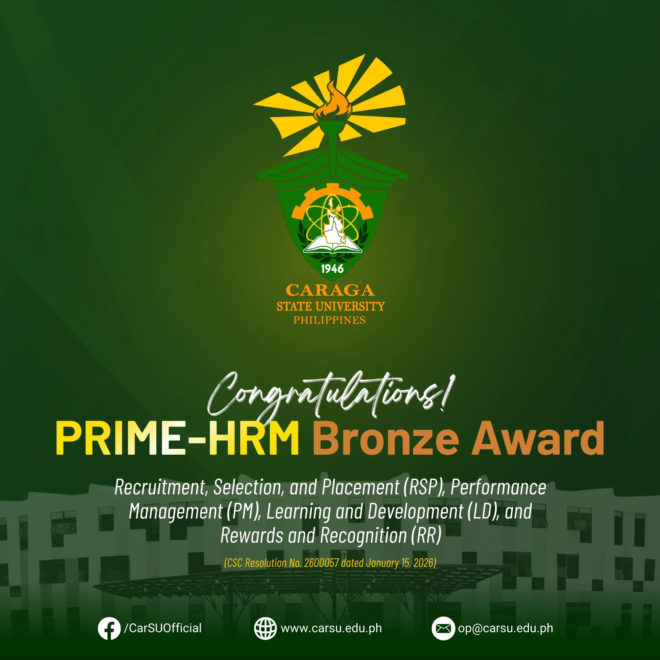 The Caraga State University (CSU) has been conferred the Bronze Award under the Program to Institutionalize Meritocracy and Excellence in Human Resource Management (PRIME-HRM) for achieving a process-defined level of human resource management across four (4) core HR systems.