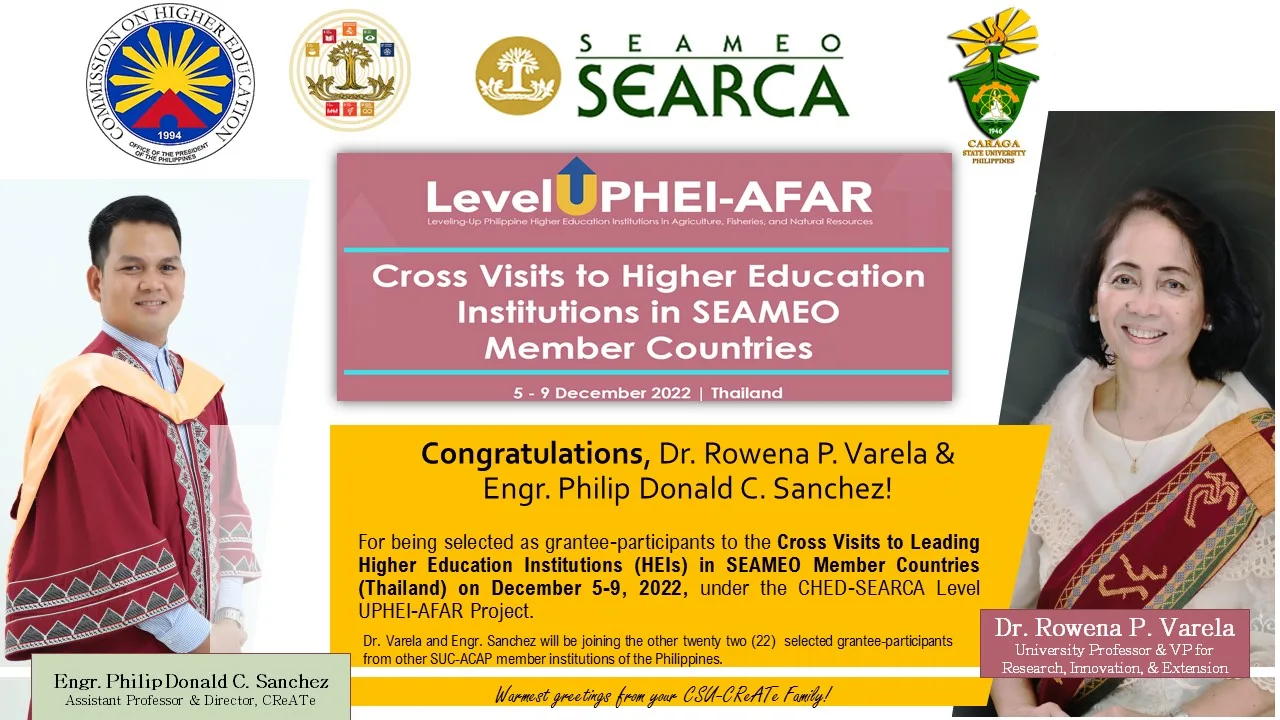 Dr. Rowena P. Varela, Vice President for Research, Innovation, & Extension (VPRIE) and Engr. Philip Donald C. Sanchez, Director of Center for Resource Assessment, Analytics and Emerging Technologies (CReATe) are select grantee-participants to the Cross Visits to Leading Higher Education Institutions (HEIs) in Southeast Asian Ministers of Education Organization (SEAMEO) member countries on December 5-9, 2022 under the Commission on Higher Education – (CHED-SEARCA) Leveling-Up Philippine Higher Education Institutions in Agriculture, Fisheries and Natural Resources (Level UP-HEI-AFAR) project.