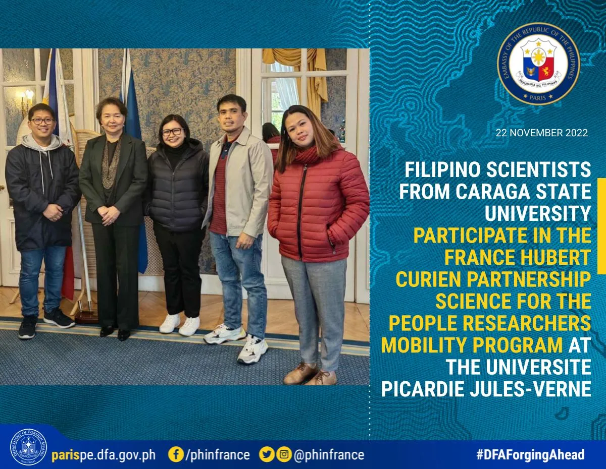 Forming part of the joint research project of Caraga State University (CSU) with the University of Picardie Jules Verne (UPJV) in Amiens France, four faculty researchers from the College of Mathematics and Natural Sciences (CMNS) were sent to France for immersion, to include visit to the UPJV research laboratories and undertake research on November 21-30, 2022.