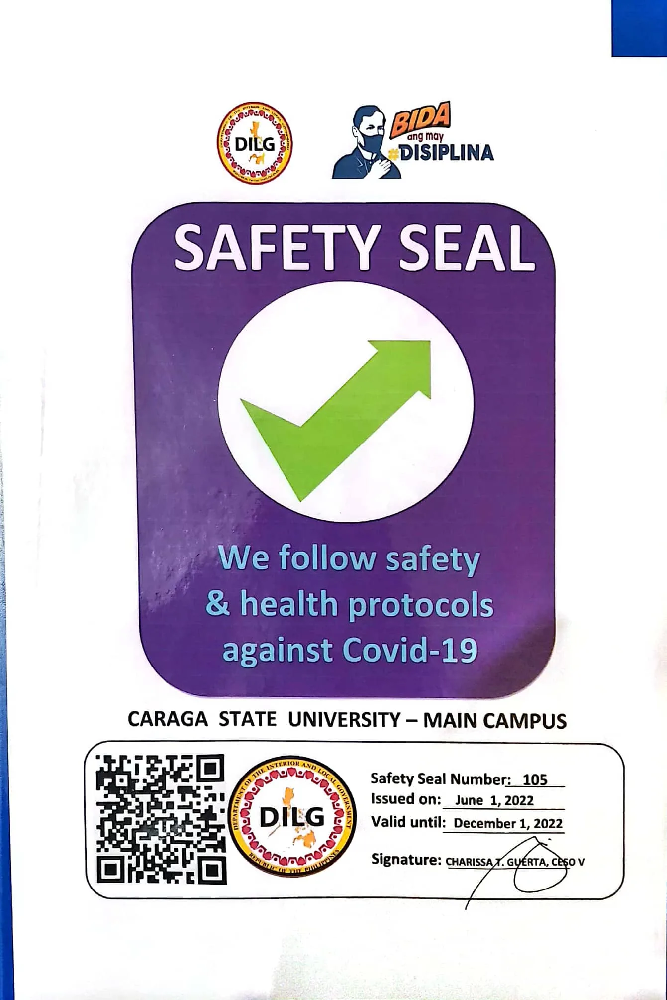 The Department of the Interior and Local Government (DILG) together with the Philippine National Police (PNP), and Bureau of Fire Protection (BFP) bestowed Caraga State University- Main Campus the Safety Seal to pilot the face-to-face classes on June 1, 2022. With the cooperation of the Office of the Vice President for Executive Operations and Auxiliary Services (OVPEOAS), the Health and Wellness department, and the General Services unit, the site inspection was conducted successfully.