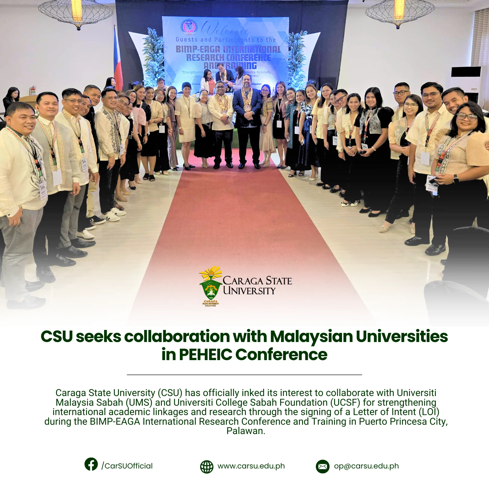 Caraga State University (CSU) has officially inked its interest to collaborate with Universiti Malaysia Sabah (UMS) and Universiti College Sabah Foundation (UCSF) for strengthening international academic linkages and research through the signing of a Letter of Intent (LOI) during the BIMP-EAGA International Research Conference and Training in Puerto Princesa City, Palawan.
