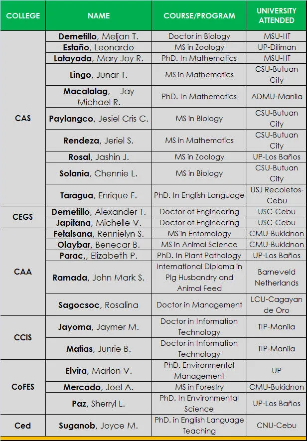 All six colleges of the University have their respective returning MS and PhD graduate faculty. The College of Arts and Sciences has the highest number of five (5) graduates; followed by the College of Engineering and Geo-Sciences with three (3), College of Agriculture and Agri-Industries,  and College of Computing and Information Systems with two (2), and College of Forestry and Environmental Science, and College of Education with one(1).