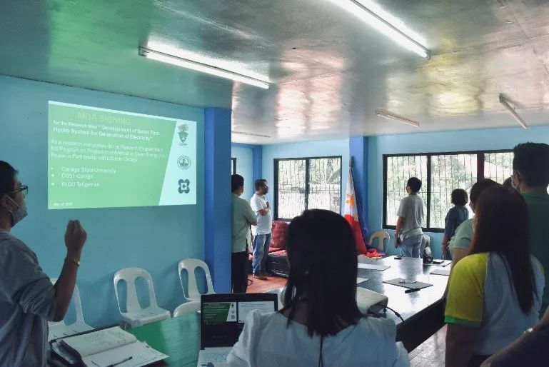 To advance this extension project, on May 16, 2022, at the Barangay Hall of Taligaman, Butuan City, a Memorandum of Agreement (MoA) has been forged between Caraga State University (CSU) through CRAFT, Department of Science and Technology-Caraga (DOST-Caraga), and Barangay Taligaman (BLGU-Taligaman) for the Smart Pico Hydro Extension Project. CSU was represented by Vice President for Executive Operations and Auxiliary Services, Dr. Luisito Tabada; DOST-Caraga by its Regional Director Engr. Noel M. Ajoc and Brgy. Captain Elegia F. Intino for the BLGU Taligaman.