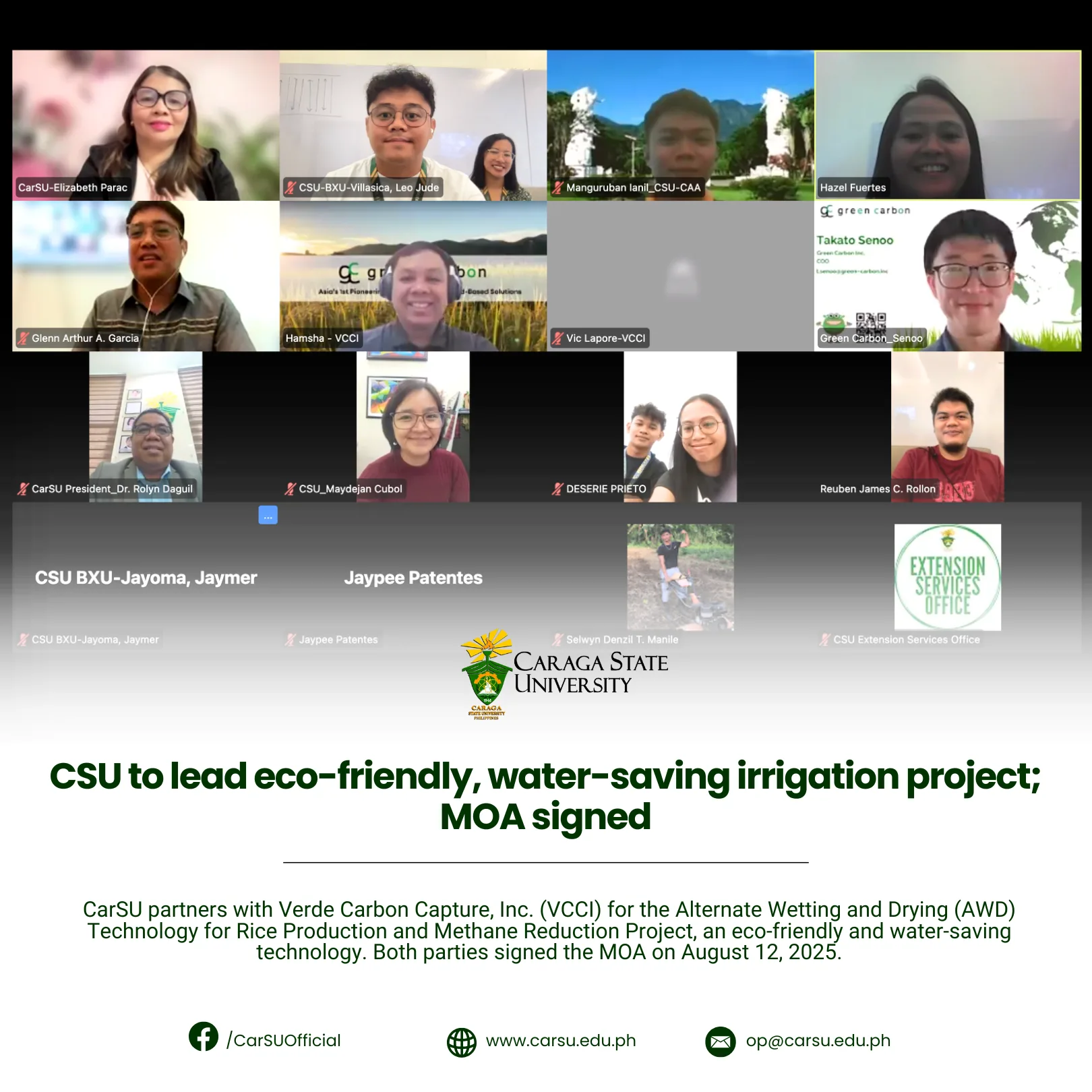 Caraga State University (CSU) formalized its collaboration with Verde Carbon Capture, Inc. (VCCI)  on the Alternate Wetting and Drying (AWD) Technology for Rice Production and Methane Reduction Project through a virtual Memorandum of Agreement (MOA) signing on August 12, 2025.