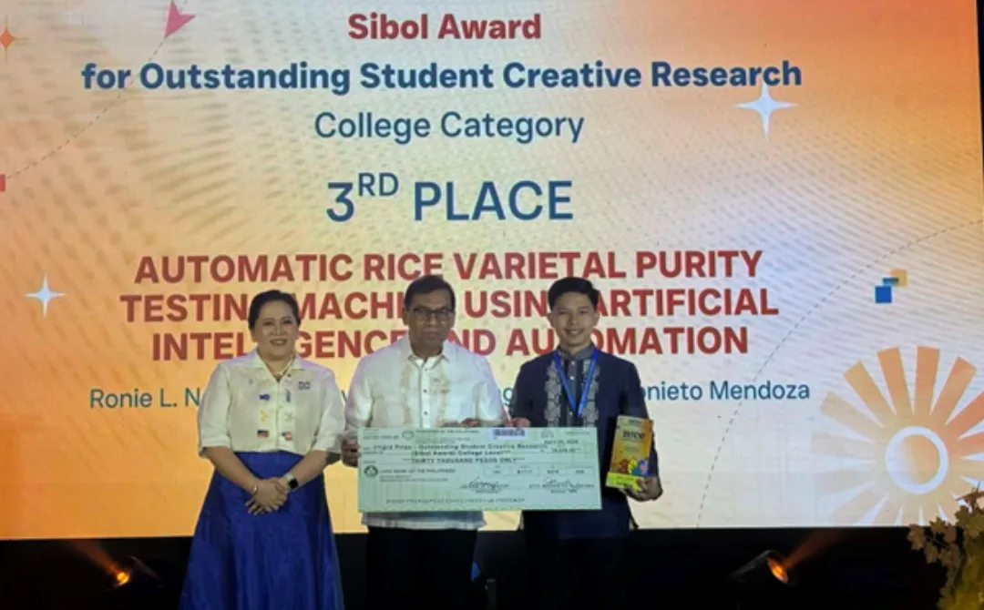 Bachelor of Science in Electronics Engineering (BSECE) graduates, Ronie L. Naquila Jr. and Jay Marie M. Bangga, secured 3rd Place – Outstanding Student Creative Research (Sibol Award) College Level Category for their “Automatic Rice Seed Varietal Purity Testing Machine using AI and Automation” during the Department of Science and Technology (DOST) National Invention Contest and Exhibits (NICE) 2026 held on April 27-28, 2026 at Acacia Hotel Manila in Muntinlupa City.