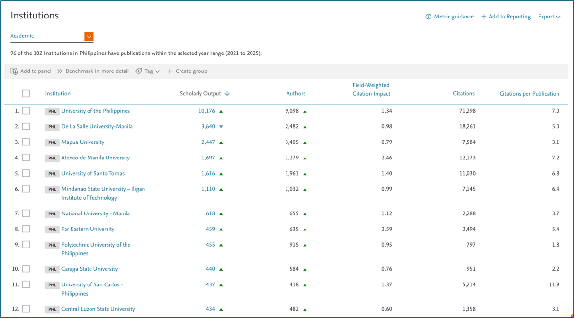 Based on the latest SciVal data covering the years 2021 to 2025, Caraga State University (CSU) ranks 10th nationwide among Philippine academic institutions in terms of Scopus-indexed scholarly output, with a total of 440 publications produced by 584 researchers. SciVal is an advanced analytics solution, built on a core of Scopus® data, that enables the flexible evaluation of any research field as well as the research performance of individuals, research groups, departments, institutions, and countries.