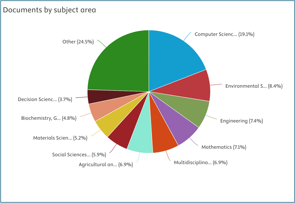 • The largest category is “Other” (24.5%), indicating that a substantial portion of research output falls outside the predefined subject classifications.