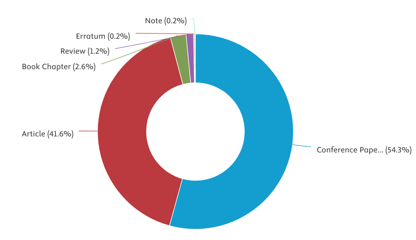 • Conference Papers (54.3%) represent the largest share, indicating that a significant portion of research findings is presented at conferences rather than published in journals.