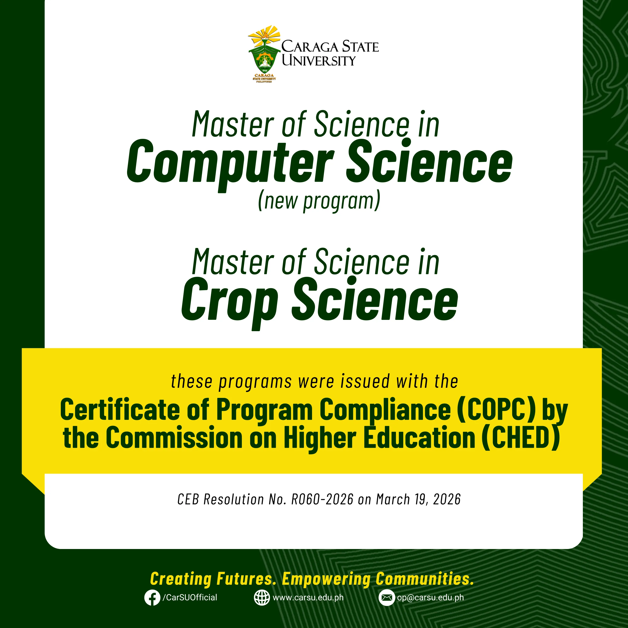 Adding to the roster of programs officially approved for operation, the Master of Science in Computer Science and the Master of Science in Crop Science were issued the Certificate of Program Compliance (COPC) by the Commission on Higher Education (CHED) on March 19, 2026. MS Computer Science will be offered in August this year.